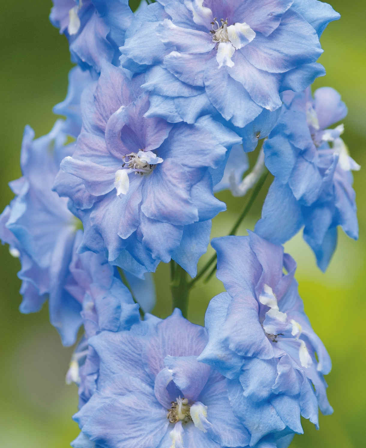 Delphinium Summer Skies – Florile albastru-pudră, fiecare cu un ochi alb, sunt distanțate uniform de-a lungul spiculelor florale puternice, creând coloane înalte de culoare. Forma elegantă, verticală a Delphinium ‘Summer Skies Group’ este utilă pentru a crea interes vertical în schemele de plantare mixte, unde se asociază deosebit de bine cu echinaceea, irișii, paeonii și eringiile.