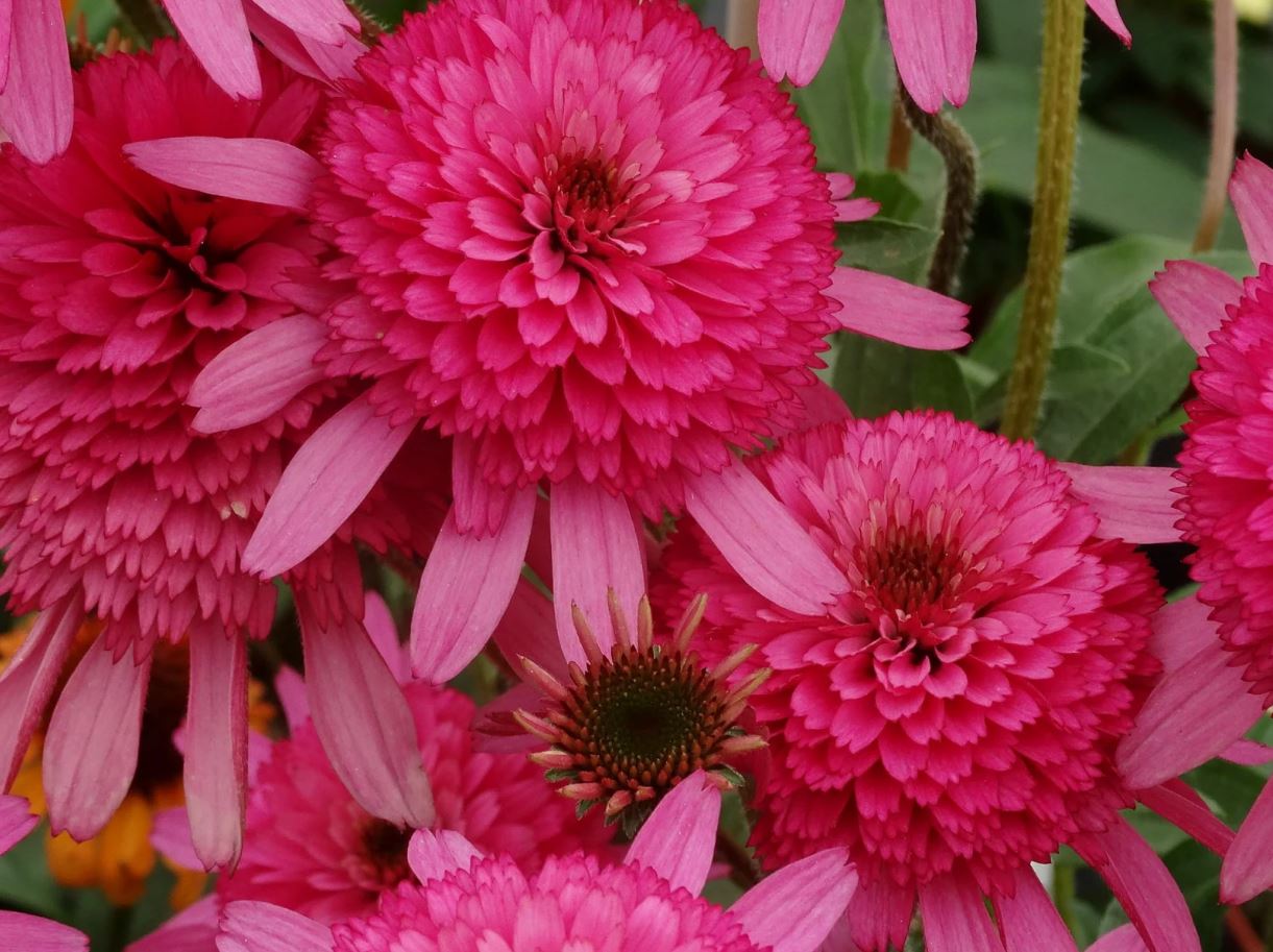 Inflorescențele sunt de tip capitul, cu petale multiple dispuse concentric, care maschează complet conul central caracteristic echinaceei clasice. Acest aspect „plin” conferă plantei un aer romantic și o face ideală pentru grădini decorative și buchete.